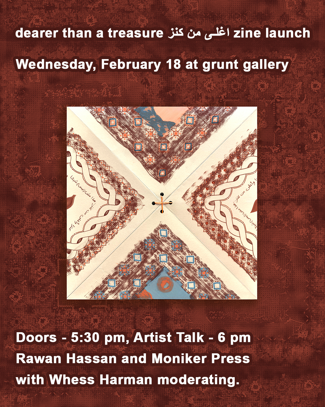 Join us on Wednesday, February 18th, to celebrate the launch of dearer than a treasure اغلى من كنز, a zine by Rawan Hassan in collaboration with Moniker Press. Doors open at 5:30pm, and don’t miss the 6pm talk with Hassan and Erica Wilk (Moniker Press), moderated by Whess Harman.
